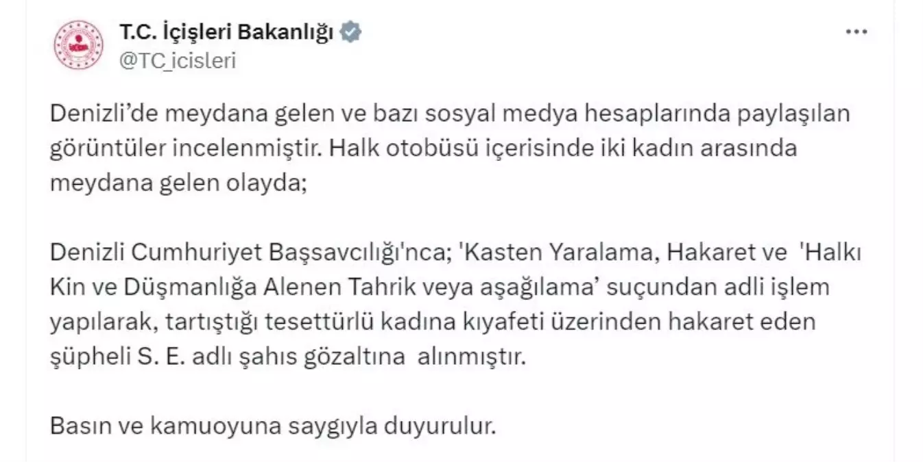 İçişleri Bakanlığı, Denizli‘de iki yolcunun hengame ettiği olaya ait toplumsal medya hesabından açıklama yaptı. Açıklamada, ” Denizli‘de meydana gelen ve kimi toplumsal medya hesaplarında paylaşılan imgeler incelenmiştir. Halk otobüsü içerisinde iki bayan ortasında meydana gelen olayda; Denizli Cumhuriyet Başsavcılığı’nca; ‘Kasten yaralama, hakaret ve halkı kin ve düşmanlığa alenen tahrik yahut aşağılama’ cürmünden isimli süreç yapılarak, tartıştığı tesettürlü bayana kıyafeti üzerinden hakaret eden kuşkulu S.E.adlı şahıs gözaltına alınmıştır” denildi.