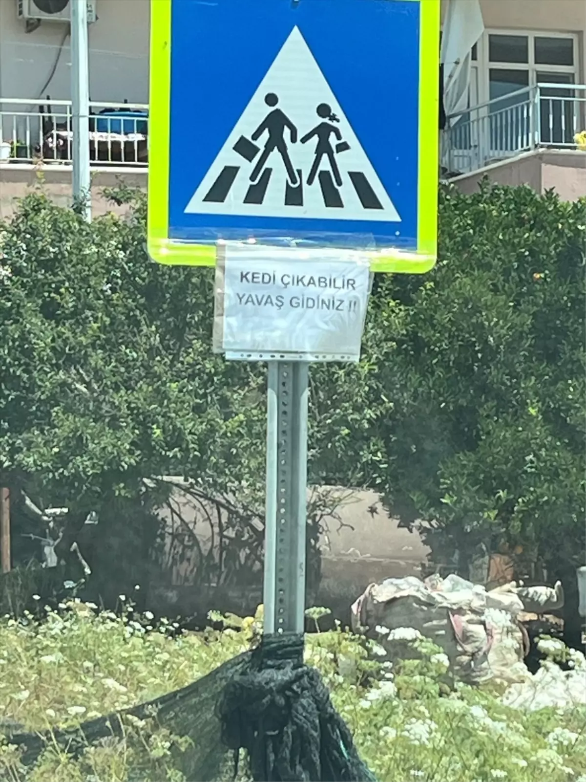 Antalya’nın Serik ilçesinde hayvanseverler trafik levhalarının altına “kedi çıkabilir” yazılı kağıtlar yapıştırarak şoförleri uyardı.