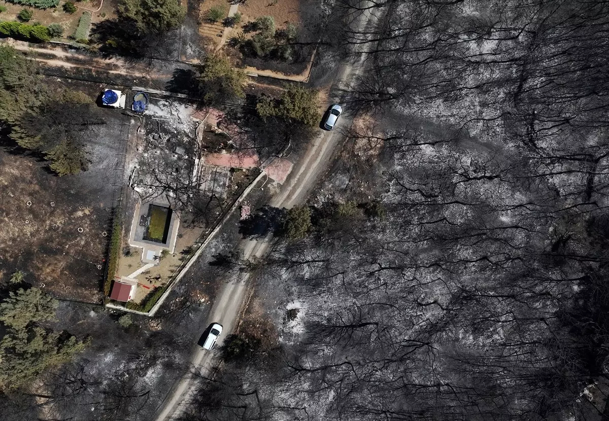 Görüntülerde ormanlık alanın alevler nedeniyle siyaha bürünmesi, yangında hasar alan konut ve araçlar yer aldı.