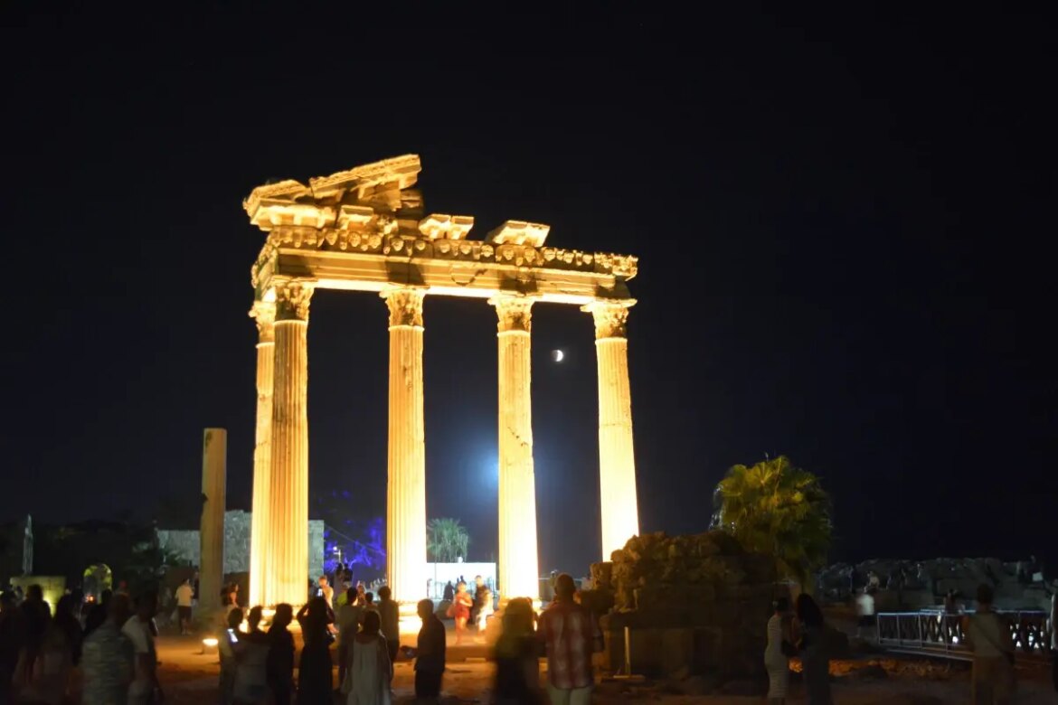 Manavgat’ın Side Mahallesi’nde bulunan ve antik devrin izlerini taşıyan Apollon Tapınağı, gökyüzü olayını izlemek isteyenler için açık hava gözlemevine dönüştü. Dün gece gerçekleşen kanlı ay tutulması sırasında tapınağın etrafında toplanan turistler, bu eşsiz tabiat olayını cep telefonlarıyla görüntüledi. Turistler Side’nin tarihi atmosferinde bu türlü bir gökyüzü olayına tanıklık etmenin tecrübesini yaşadı.